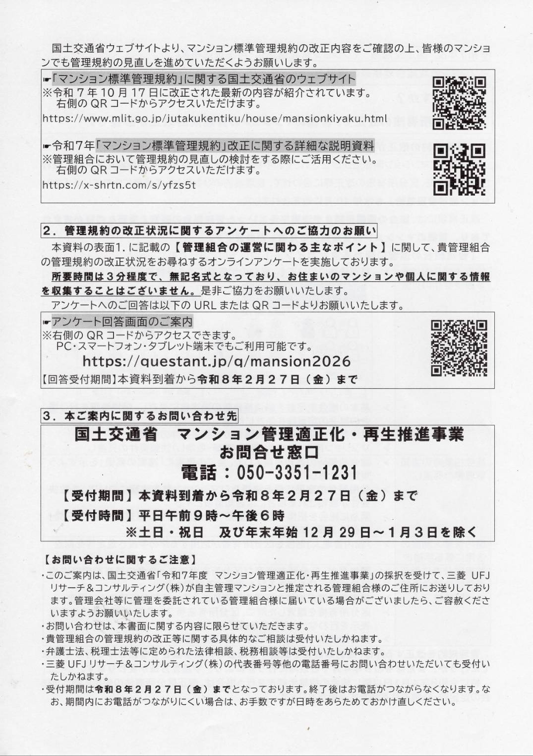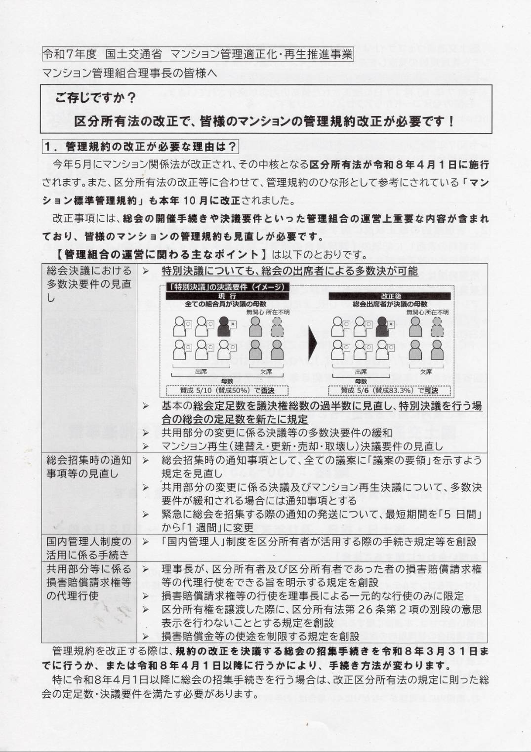国土交通省より、全国のマンション管理組合の理事長宛に下記のような「管理規約改正」を促す通知が届いています。 令和7年5月に成立した改正区分所有法が、令和8年4月1日より施行されることに伴い、皆様のマンションのルールブックである「管理規約」の大幅な見直し=改正が必要となることの通知です。