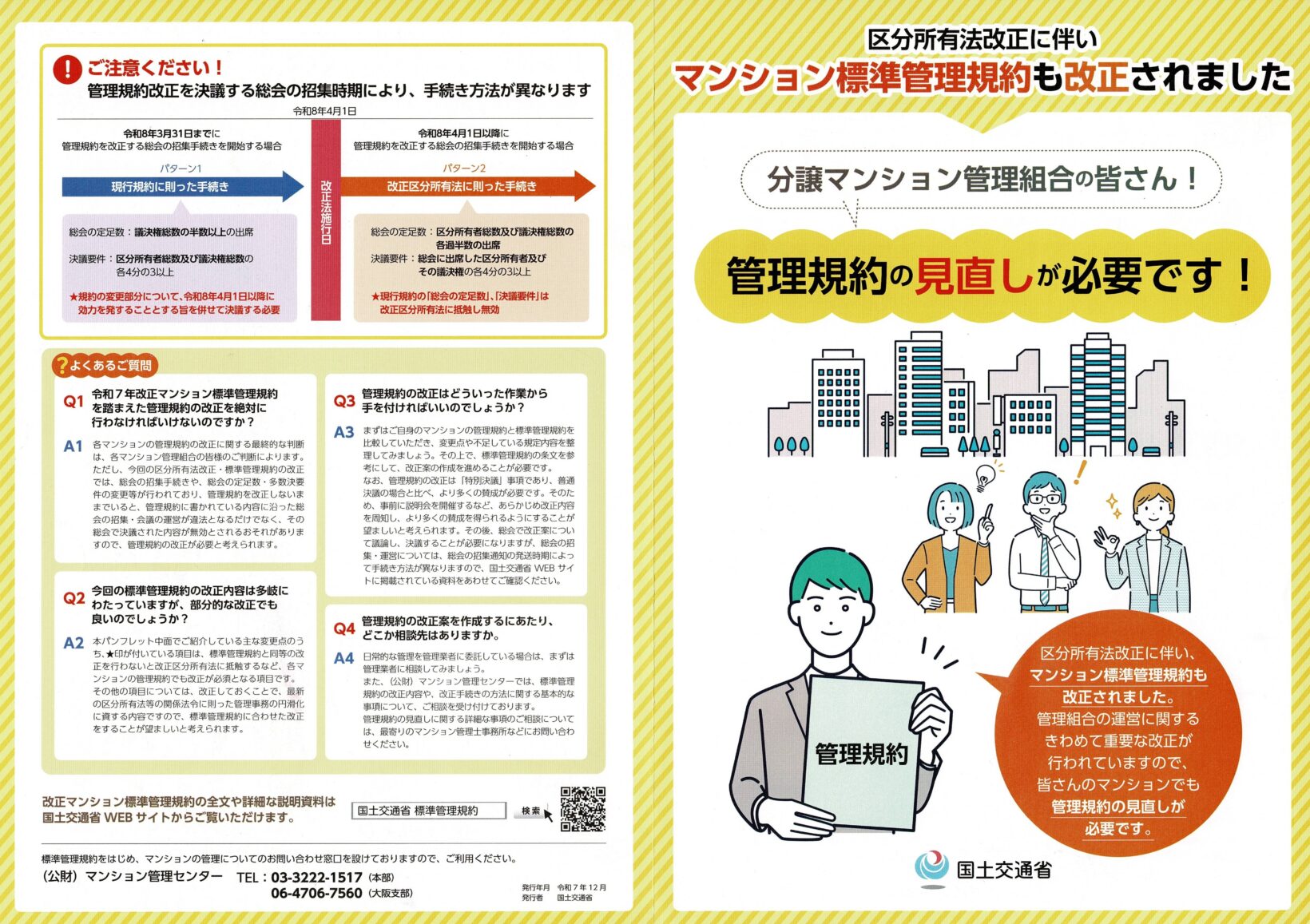 以前も記事として紹介しましたが、令和8年4月1日より、改正区分所有法が施行されます。今回の改正は、法改正に伴う「管理規約の見直しが必須」となる非常に重要な内容です。そのため添附のように国土交通省からも「管理規約の見直しが必要です!」とのパンフレットが各所に配布されています。